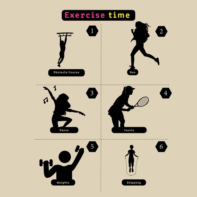 All these ideas can be done at home, without equipment, in short bursts. Even if the running involves laps around the garden, the obstacle course comprises crawling under a table, jumping over cushions, and finishing in a roll. Tennis can be your kid throwing teddies at you while you bat them away with your hands. This is one of Rafiki's favourite games, and since he always wants me to stretch and run for it, it can turn into quite the cardio blast. Weights can be giving your kid a piggyback or filling bottles with water. To take it to the next level, head to a park or a playground and do your mini workout there.